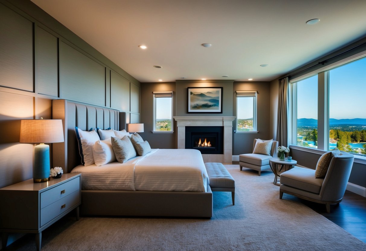 A spacious master bedroom with a king-size bed centered against a feature wall, flanked by matching nightstands and soft lighting, leading to a cozy seating area with a fireplace and large windows overlooking a scenic view